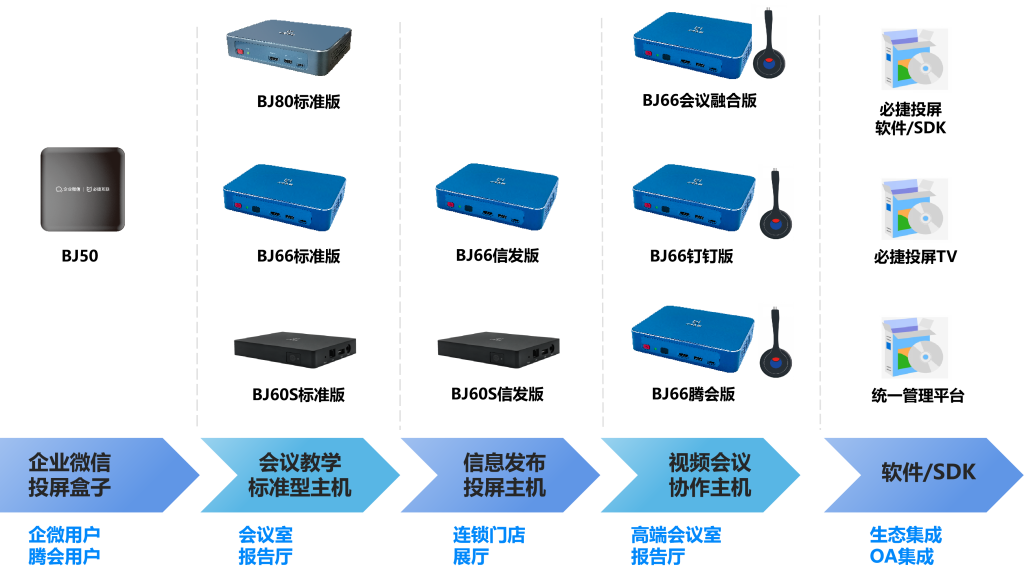 考虑到政企教单位的规模化应用需求,必捷互联解决方案采用极简操作设计,支持扫码投屏、投屏码配对、一键投屏等多种连接方式,3秒即可完成投屏,无需专业技术培训。在运维层面,提供统一管理平台,支持大规模设备部署与远程管理,运维人员可实时监控设备状态、排查故障;同时配备7×12小时政企专属技术支持,提供国产化系统适配包(含驱动、SDK)与定制开发服务,确保方案快速落地与稳定运行。